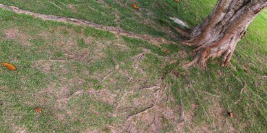 Grinding down exposed surface roots that are trip hazards or interfere with mowing and landscaping, usually around larger trees.
