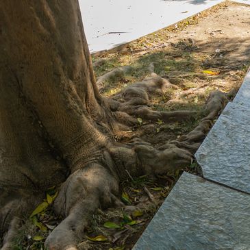 Grinding down exposed surface roots that are trip hazards or interfere with mowing and landscaping, usually around larger trees.